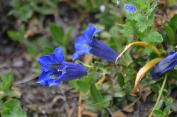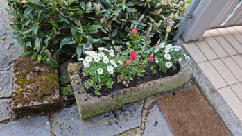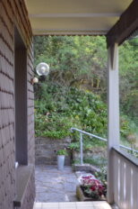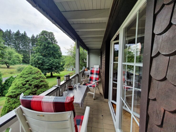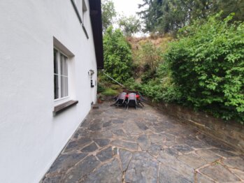 Terrasse neben dem Haus, nicht überdacht, aber auch mit Gartenmöbeln im Grünen